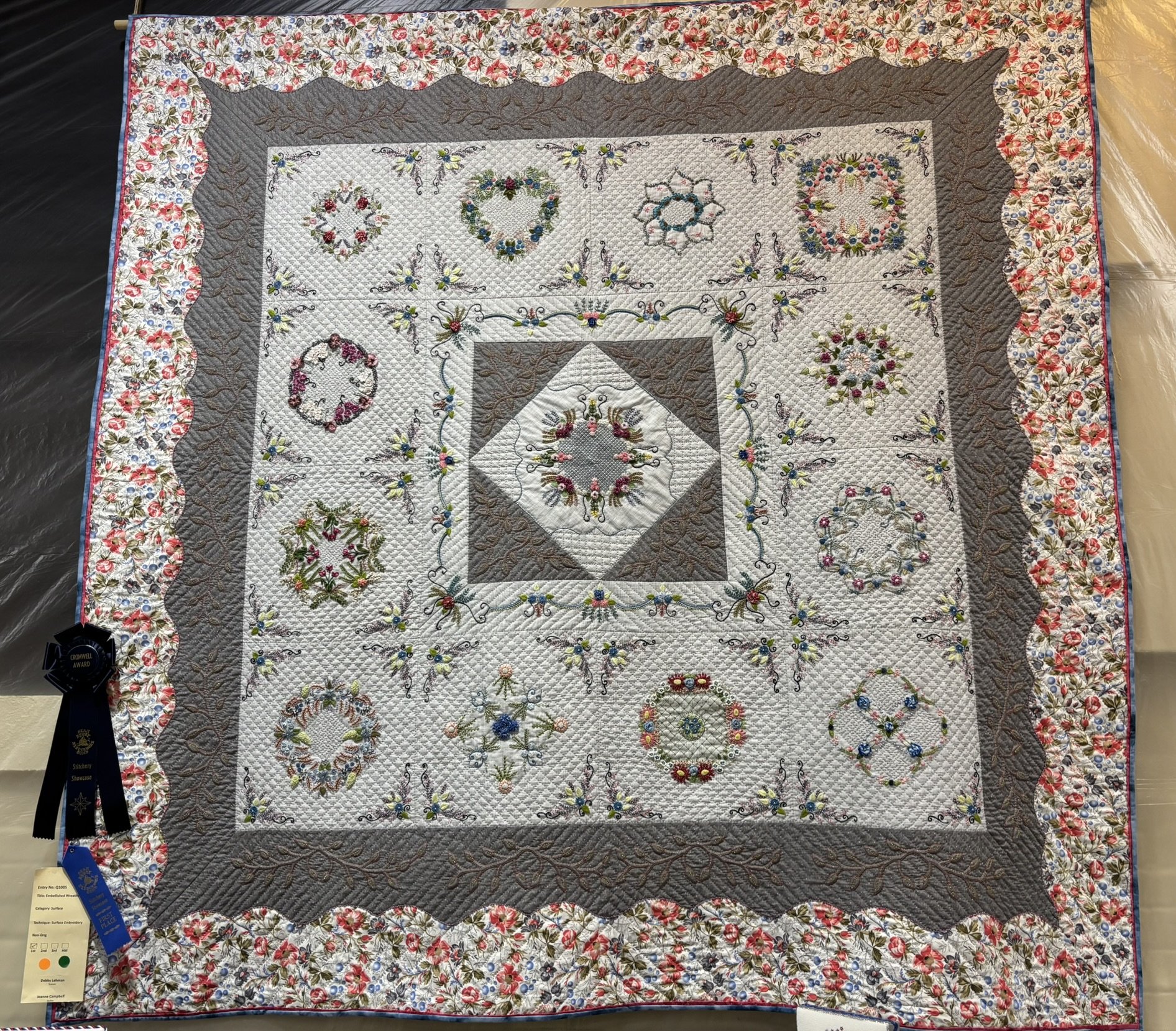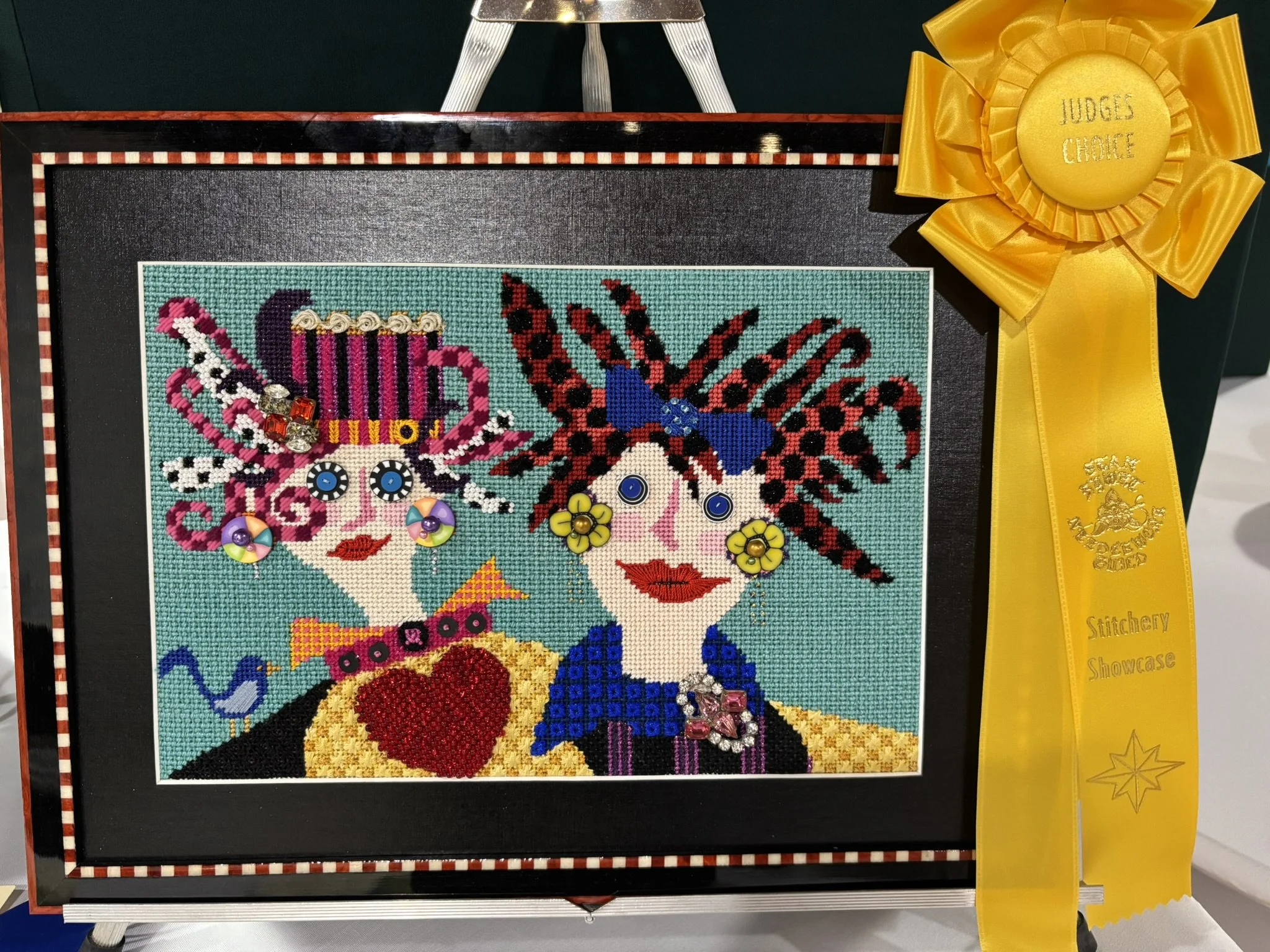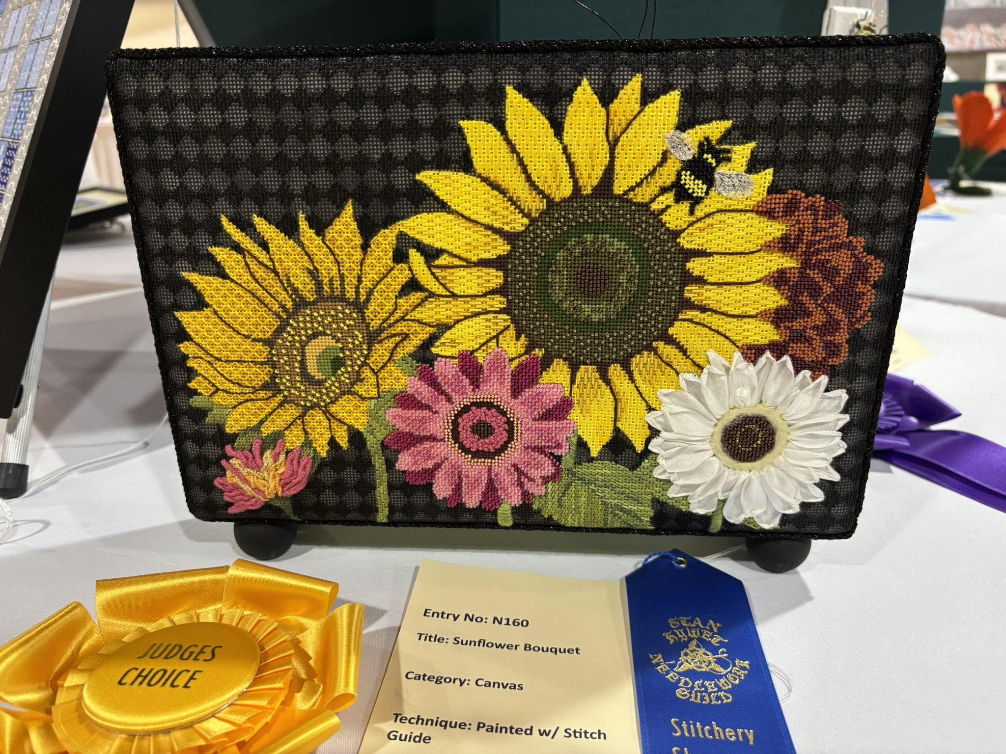 The 2025 Stitchery Showcase featured over 350 pieces of gorgeous needlework and quilts from 95 entrants. The display filled the room with beautiful scenes of flowers, animals, trees, traditional samplers and pillows, spooky witches, Santa Claus, jewelry and jackets, and many intricate geometric designs. All of these pieces were lovingly made with a needle and thread using a broad spectrum of colors, varying techniques and materials, and styles ranging from traditional to very contemporary. Canvas was the largest category with 156 entries.